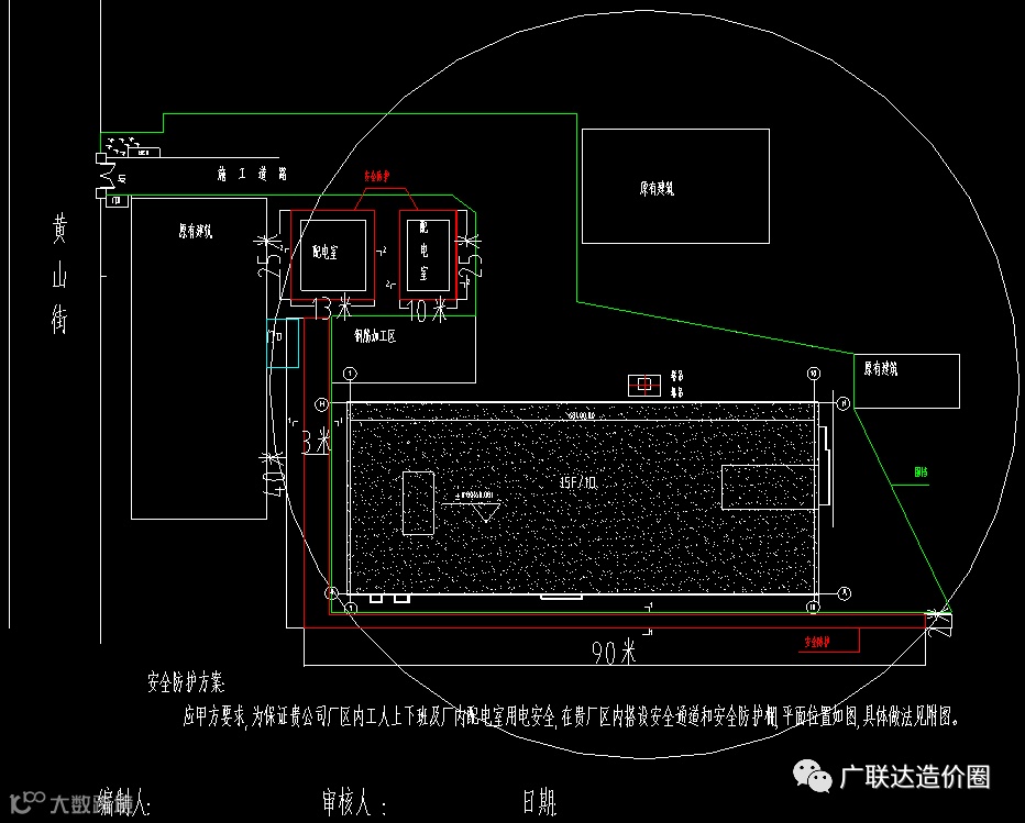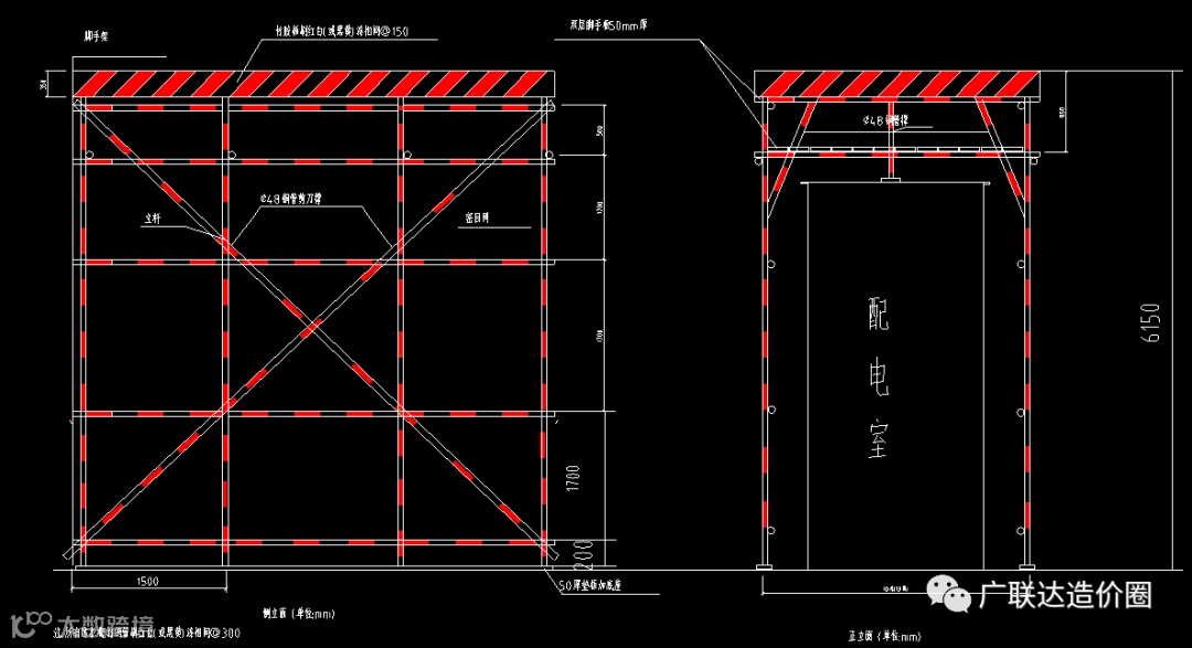 工程围墙外有一甲方厂区员工道路和两个配电房在塔吊回转半径范围内(见图1、2、3),业主厂区人员由此道出入上下班。为求安全,业主要求搭设防护棚。