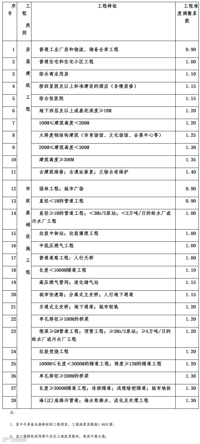 工程复杂程度调整系数:0.8~1.2(工程复杂程度具体调整系数由工程咨询机构与委托单位根据各类工程情况协商确定)。