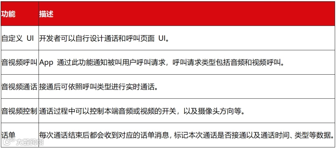 呼叫组件(NERtcCallKit)支持的功能如下表所示。