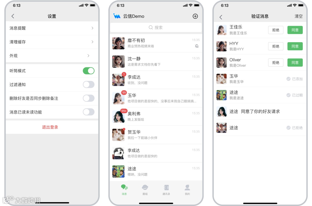 原生组件支持安卓、iOS两端,可实现的功能有好友关系黑名单管理、文本图片地理位置等完整消息体、回复转发撤回等丰富消息功能,同时支持单聊、临时讨论组、高级群聊等类型。