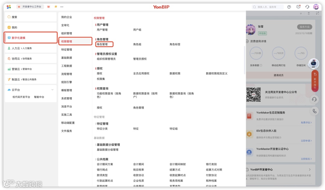 在菜单导航中选择:「数字化建模」->「权限管理」->「角色管理」并点击进入服务。