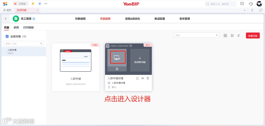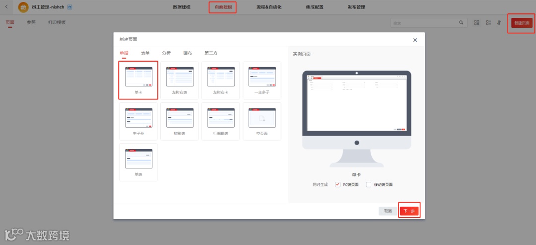 切换至页面建模页签。点击右上角新建页面,选择单卡,点击下一步
