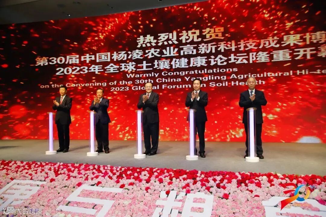 全国人大常委会副委员长雪克来提·扎克尔,农业农村部部长唐仁健,陕西省委书记赵一德,陕西省省长赵刚,农业农村部副部长马有祥共同为第三十届中国杨凌农业高新科技成果博览会、2023年全球土壤健康论坛启幕。