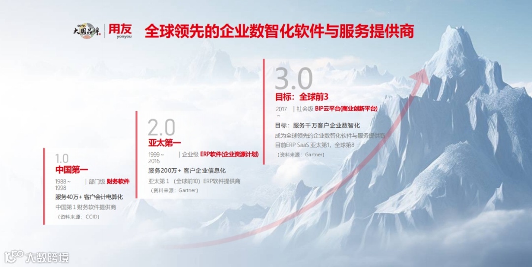 用友自1988年创立以来,一直专注于信息技术在企业与公共组织应用与服务领域,见证并参与了中国企业电脑化、信息化和数智化进程,持续引领企业服务产业发展。用友1.0时期,通过普及财务软件,服务超过40万家企事业单位的会计电算化,成为中国最大的财务软件公司;用友2.0时期,通过普及ERP,服务超过200万家企业的信息化,成为亚太最大、全球前10的ERP软件提供商。