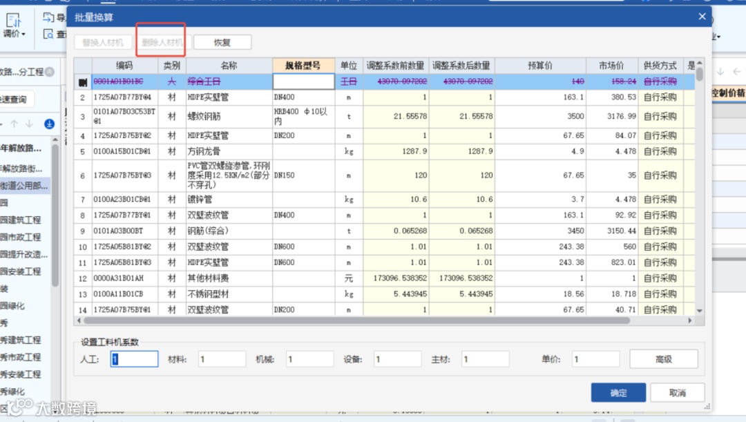 人材机支持单条/批量右键删除,删除后对应定额下人材机删除,确定后,不保存时,可批量撤销换算;保存后,也可指定范围右键取消换算