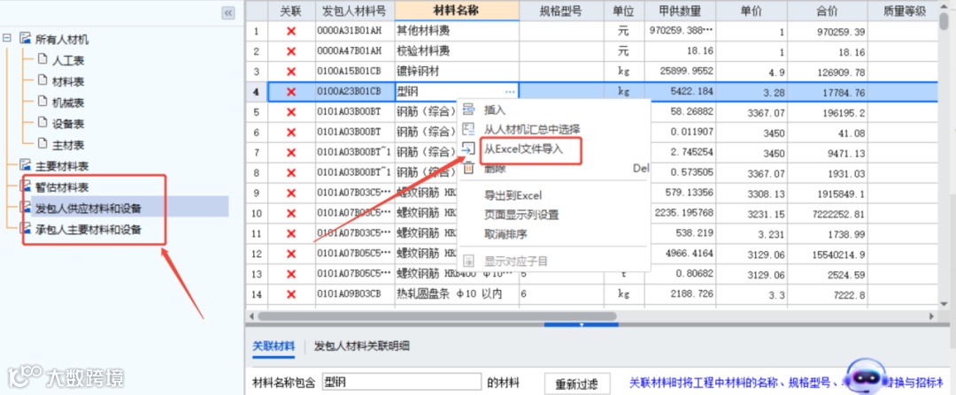 针对暂估材料、发包人供应材料和设备、承包人主要材料和设备,材料EXCEL,就带这些信息,然后走关联材料,价格可以导入,关联