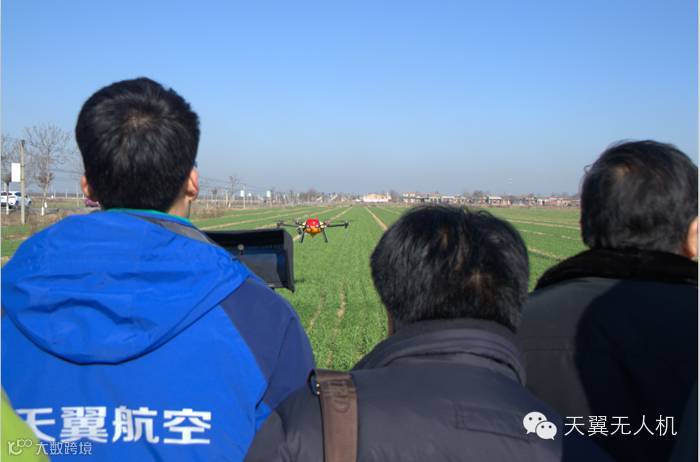 植保直升机、无人机在农业方面有着高效安全、覆盖密度高防治效果好、节水节药节成本及飞控导航自主作业等方面的优势,而天翼自主研发并广泛运用于直升机、多旋翼无人机等 方面的技术已成熟并在市场上有良好的实用效果获得一致好评。在对整体的农业植保发展趋势做了相关的调研后,天翼航空一行带领领导深入天翼团队冬季小麦作业现场进行观摩,在作业现场领导专家们对后期植保无人机发展及现有的天翼航空无人机作业标准、亩喷洒药剂总量及作业喷洒喷头压强等相关问题给出的部分建议。