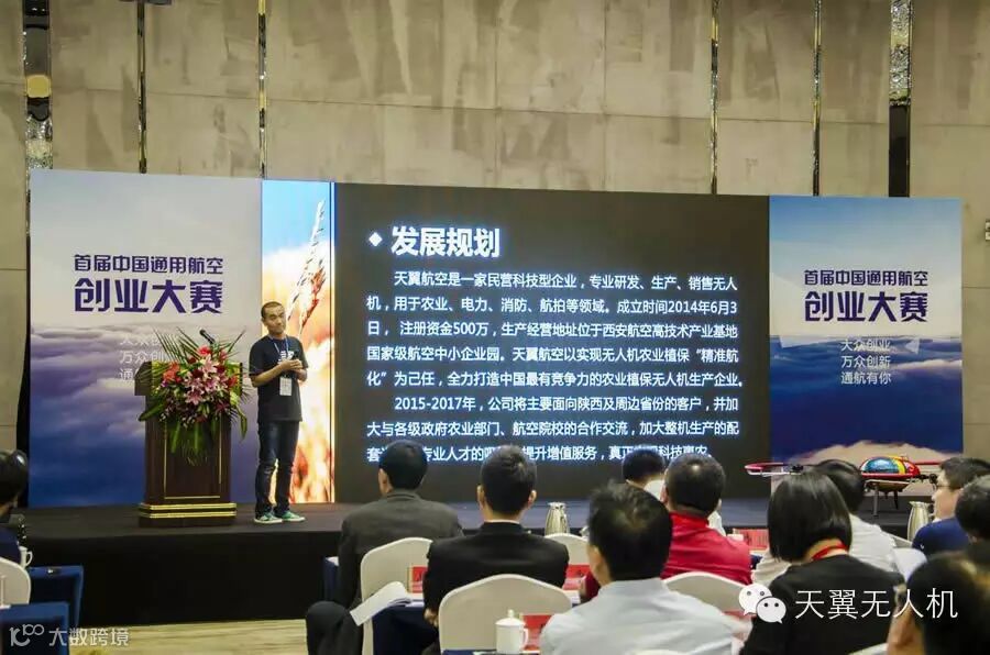 今天上午10点,西安航空基地天翼航空科技有限公司技术总监陈金秋野先生第一个登上大赛舞台,展示天翼航空农业植保无人机。陈金秋野向各位专家和评委认真汇报了天翼航空农业植保无人机。大赛介绍了本公司自主开发的农业植保无人机,陈总讲: 天翼航空ty-4x植保无人机性能日趋成熟,系统日臻完善,载荷不断提高,并逐步向小型化、智能化、多功能方向发展;天翼航空正在不断努力完善设备平台,实现更加完备的自主空中飞行,并完成规定的矩形航线、搜索与识别移动目标、失控自主返航、仿地飞行等一系列重大改进和升级。在强大智能化设计的同时不断提高有效载荷,满足植保市场的特定需求。公司的核心运营项目是使天翼成为中国农业植保现代化,“精准航化”综合农业产业服务的集团企业。以服务农业的根本宗旨,带动通用航空关注三农、服务三农,保障粮食安全,保障食品安全,促进通航产业开展广泛合作。天翼航空“植保空无人机”每架次可喷洒10-15亩,日作业可达200-300亩,一架飞机可实现10个人一天的作业面积,因此,大大提高了病虫害防治的速度,有效控制病虫害大面积爆发和传播,减轻农民负担,降低人工喷洒风险,精准航化,提高粮食产量,确保食品安全,是惠及“三农”的 科技新产品。大赛现场中国民航干部管理学院副院长高洪江先生、国家商务部投资促进局副局长张玉中先生、北京市经济和消息化委员会副主任李洪先生、中国民航科普基金会副理事长茅顺平先生、民航局运输司通航处处长靳军号先生、中国航空器拥有者及驾驶员协会执行秘书长柯玉宝先生等专家组成评委对天翼航空的农用无人机给于了及高的评价。大赛后专家组将对天翼航空农用植保无人机进行专业评估,并引进风投对天翼航空项目进行投资,通过本次大赛天翼航空不仅得到了专家的肯定同时更多的是赢得了风投公司的认可。天翼航空有幸参加本次大赛,也是本次大赛全国唯一一家农用植保无人机的参赛选手,将通过资本市场和风投迎来一个崭新的农用植保无人机研发和制造的发展新时代。