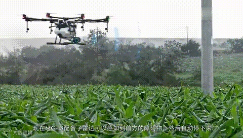 农田当中有很多障碍物(电线杆,树木,斜拉线等)MG-1S配备了避障雷达,可以感知前方障碍物,在障碍物前方6m处左右自动停下