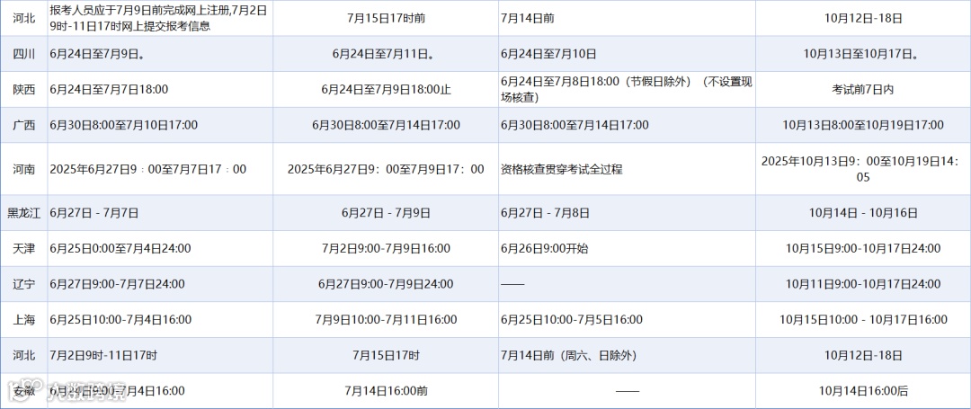 20多地的报名时间、缴费时间、资格审核时间、准考证打印时间,如下图:
