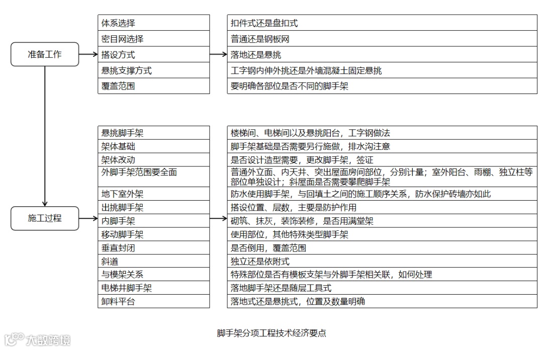 降本增效注意:承包模式的选择,是传统的班组清包+自供租赁器材,还是将这两项合并形成扩大劳务分包;材质与体系选择;工期控制。其他技术经济要点参见下图:
