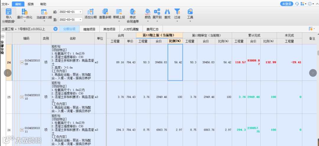 填写完相应数据之后,软件会自动计算累计完成及未完成供大家参考。如果有超合同工程量的话,软件也会有红色标识给大家作出提示,防止超合同量导致大家需要重新进行报量,避免重复工作。