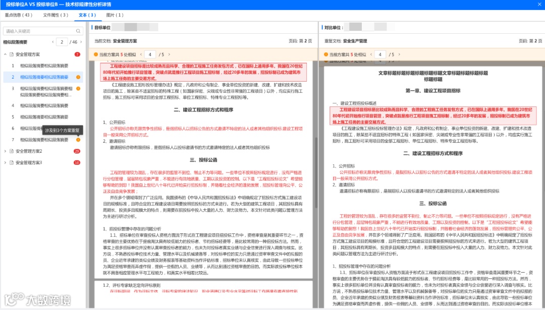 智能识别雷同内容是否为实质性重复,过滤掉目录、技术标准、与招标雷同内容等非实质性内容。