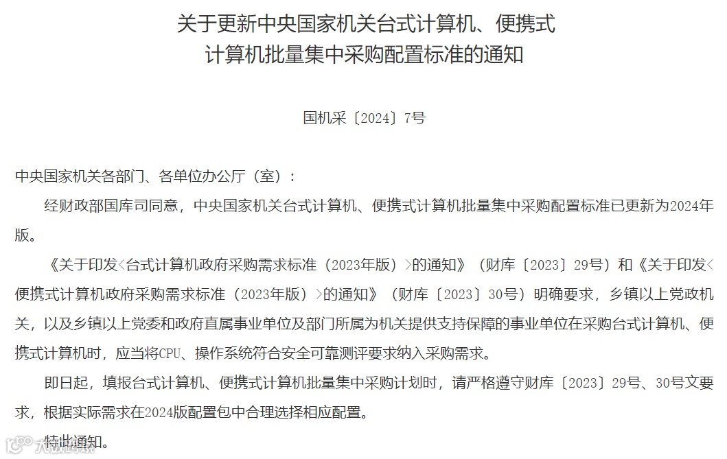 2024年3月,国机采发布【2024】7号文件,要求,乡镇以上党政机关,以及乡镇以上党委和政府直属事业单位及部门所属为机关提供支持保障的事业单位在采购台式计算机、便携式计算机时,应当将CPU、操作系统符合安全可靠测评要求纳入采购需求。