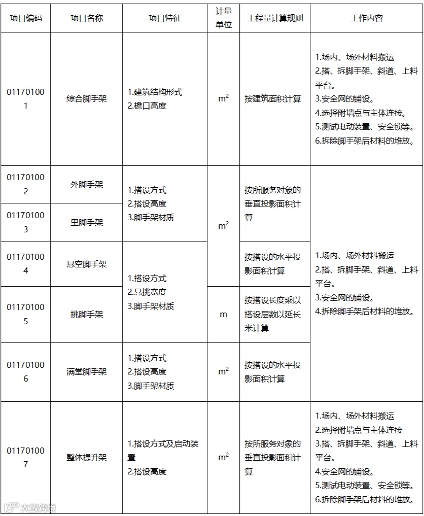 4、 “24标准”将“13规范”里的综合脚手架、外脚手架、里脚手架、悬空脚手架、挑脚手架、满堂脚手架、整体提升架、外装饰吊篮,项目名称统一调整为脚手架,项目编码011601001。