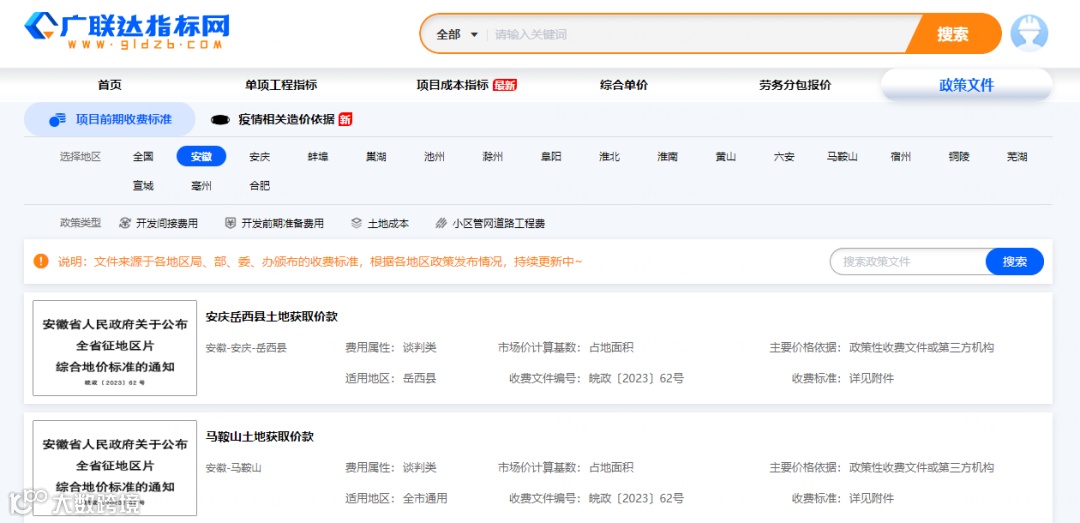 ①国有甲方、地产甲方、咨询企业、设计等企业,前期拿地、投资估算、项目概算时,需要测算各类政策性收费的非建安成本,参考指标网提供的政策文件模块,可以常看到民建项目各类政策的取费标准、计算依据及原始的取费文件;节省了到处查找的时间;
