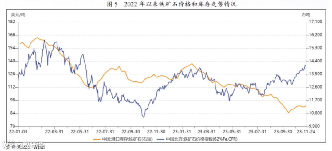 从库存端来看,2023年1-2月,全国主要港口的铁矿石库存保持在高水平,这主要是由于春节运力减少等因素所影响。然而,从3月开始,国内铁水产量有所增加,铁矿石的疏港速度也相应加快,导致主要港口的库存量持续下降。