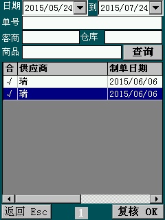 输入查询条件,点击“查询”按钮,显示查询查询结果,在结果列表中点击行头,可“合并”相同供应商的单据,点击“复核”进入复核界面;