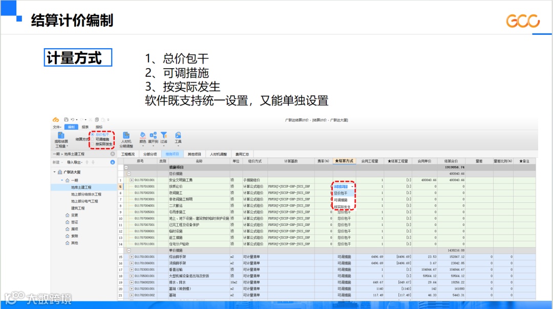 软件支持的计量方式为【总价包干】、【可调措施】、【按实际发生】三种,同时措施部分的结算方式既支持统一设置,又能单独设置。