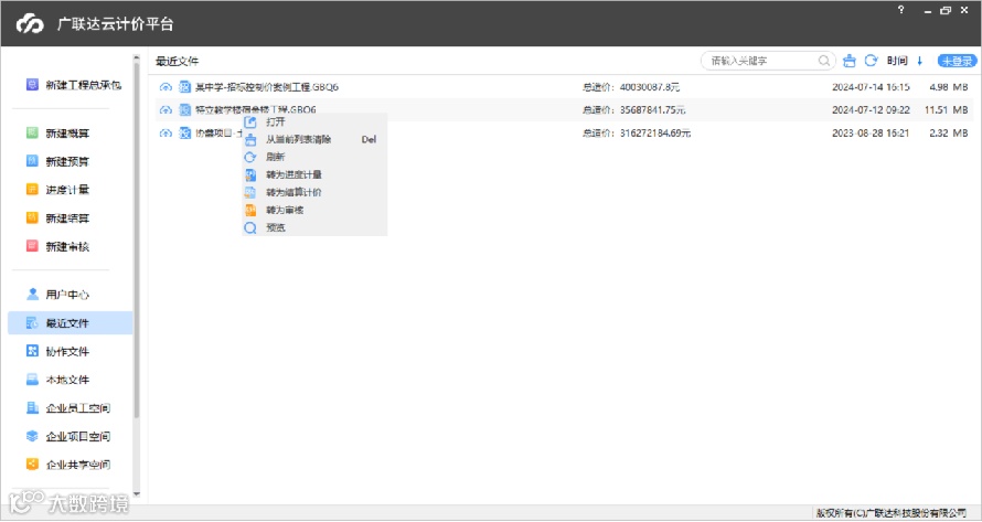 第二种方式,在最近文件的平台界面,将合同文件直接转为结算计价;