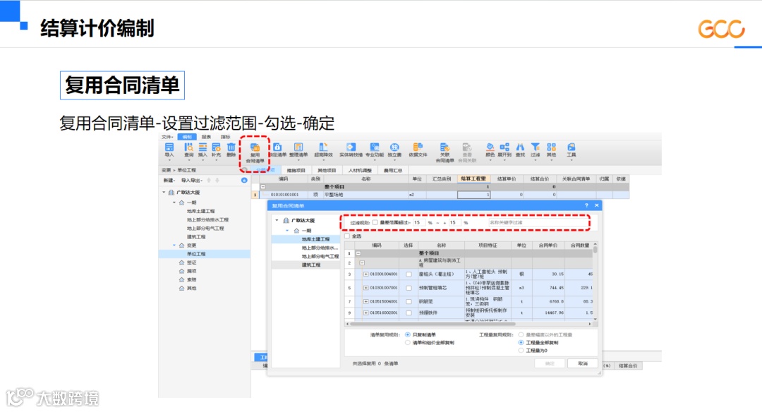 软件中提供了快速复用合同清单的方式。点击分部分项的工具栏中复用合同清单,在弹出的窗体中设置过滤的的范围也就是量差范围超过±15%的清单,然后勾选这些清单,确定,即可完成快速的复用。省时且不易出错。