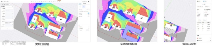 通过广联达总图规划插件,能进行实时日照、实时间距计算、计算结果随设计修改同步变化,并自动计算经济指标,真正实现边设计边分析,助力高效的总图设计。