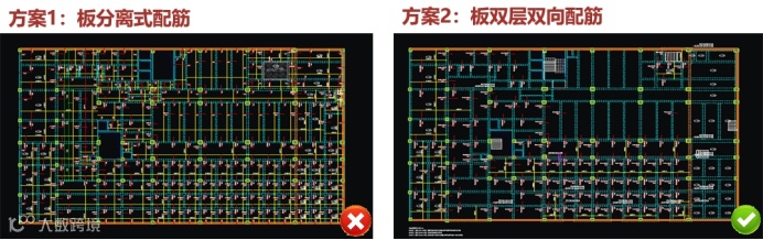 本工程为双层地下车库,负一层部分功能为货物储存区,考虑后期实际使用过程中荷载较大,在初步设计阶段进行配筋方案比选时,给出了2个初步方案: