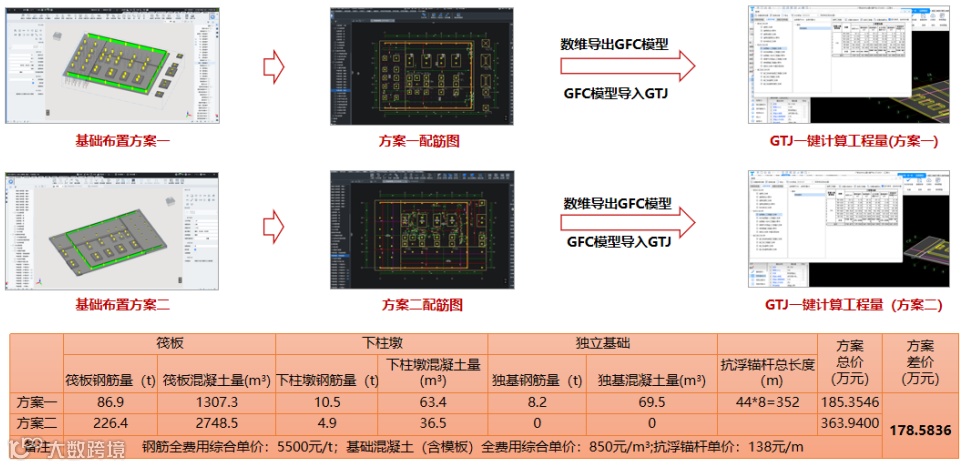 在基础方案比选过程中,通过设计模型一键转换算量模型,高效完成钢筋及混凝土工程量的统计,进而快速获取量差与价差;设计工程量指标获取效率较传统方式提高3倍。