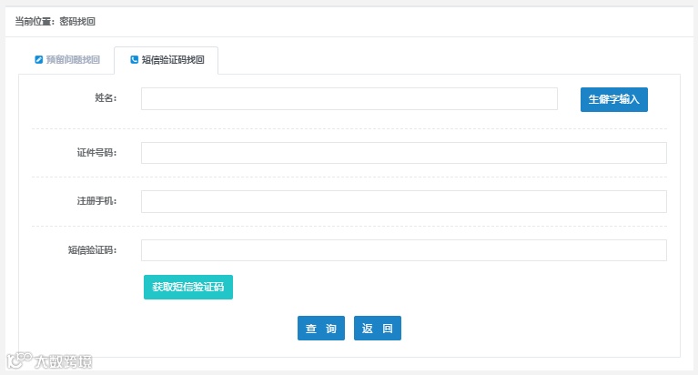 按钮,查询出考生注册时填写的密码找回问题,填写正确答案后,跳转到密码重置界面浏览注册用户名,并