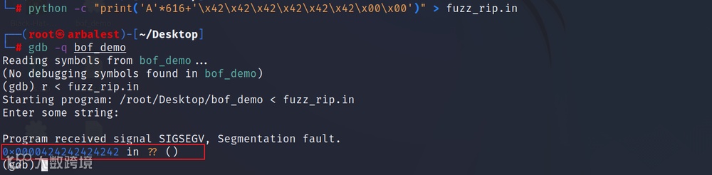 用另一台kali监听,然后执行命令./bof_demo_exploit.py|./bof_demo,将print的结果传输给漏洞程序