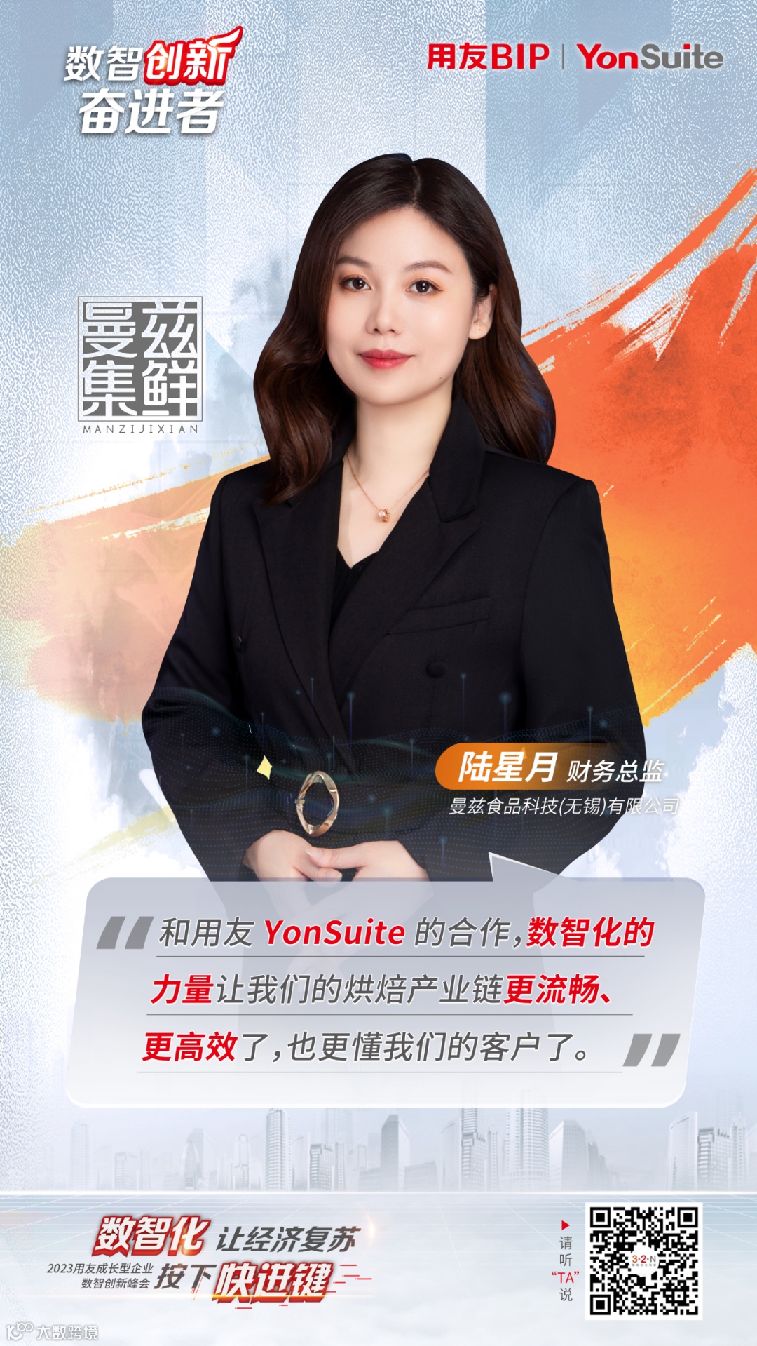 曼兹食品财务总监陆星月女士提到:“用友YonSuite助力曼兹食品进行数智化平台建设,为烘焙食品经销商搭建消费者智能化、数字化管理体系,帮助众多创客打造智慧门店,实现业绩高增长、高利润、高复购率。”