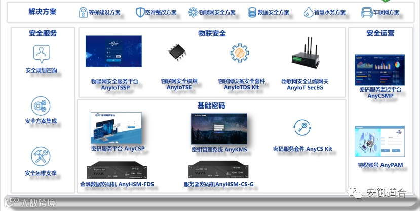 安御道合是一家以密码学为依托,将密码技术与业务场景高度融合的创新型高科技企业。公司基于密码技术的创新应用,构建以物联安全、基础密码和身份认证为核心的三大产品线,形成支撑海量亿级密钥管理平台、物联网安全服务平台、可信服务管理平台和智能身份认证平台四大核心产品。
