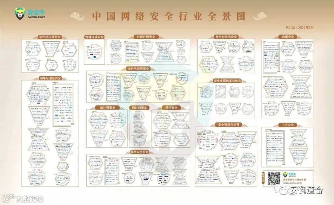 2022年3月31日,国内网络安全行业权威媒体安全牛发布《中国网络安全行业全景图(第九版)》。全景图包含14项一级安全分类,94项二级安全分类;全景图共收录433家国产网络安全企业和相关行业机构,二级细分领域共收录2609项,较第八版增加486项;
