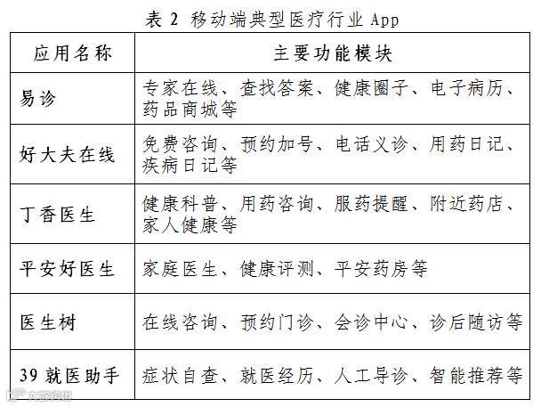 国内移动医疗正处在发展初期和试商用阶段,主要基于移动互联网、大数据、云计算等技术向医疗卫生机构及其从业人员、病患者、医药及设备企业提供高效服务,内容包括:医院信息管理系统、远程医疗、预约挂号、智能导诊、电子病历和处方等(表1)。目前,医疗平台网站等市场主体主要采用手机APP等方式(表2),将在线医疗业务迁移至移动端,并尝试将移动支付嵌入到远程医疗、预约挂号、支付医药费用等服务方面,以探索形成一整套科学有效的商业模式。