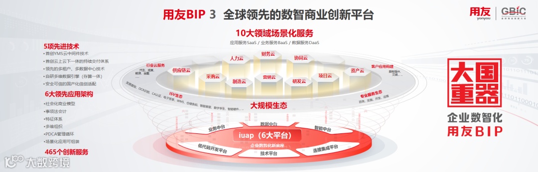 经过6年的规模研发、持续迭代,用友BIP已进入到第三个发展阶段——“用友BIP 3”,在平台技术、应用架构、创新服务等方面实现多项重大突破与升级,达到全球领先水平,包括5项首创或领先的技术、6大领先的应用架构、465项创新服务,以及快速增长的生态体系。