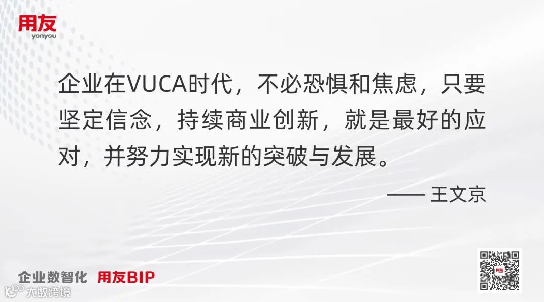 当前,数字经济正成为重组全球要素资源,重塑全球经济结构,改变全球竞争格局的关键力量。企业在感受到数字科技持续、快速发展的同时,也迎来了更多的不确定性。王文京指出,企业在VUCA(易变性、不确定性、复杂性、模糊性)时代,不必恐惧和焦虑,只要坚定信念,持续商业创新,就是最好的应对,并努力实现新的突破与发展。