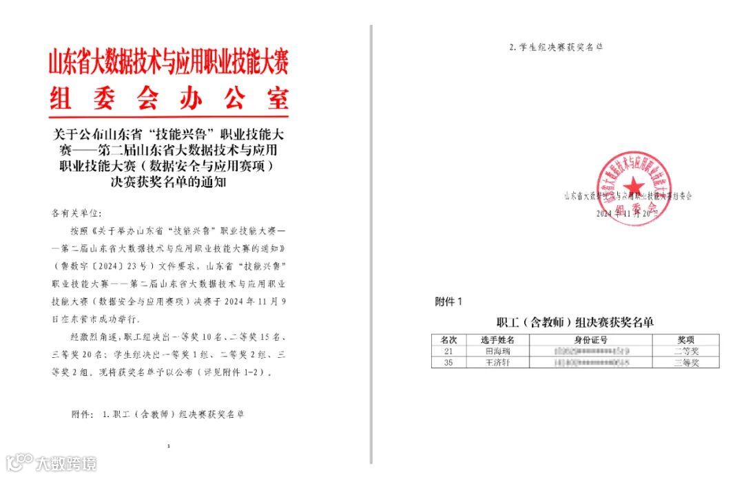 在数字化、智能化时代,数据安全的重要性日益凸显。随着新一代信息技术的迅猛发展,数据安全已成为各行各业关注的核心议题。近日,第二届山东省大数据技术与应用职业技能大赛决赛公布成绩,北京卓识网安技术股份有限公司团队成员田海瑞和王济轩凭借其卓越的技术实力与专业能力,在大赛中表现优异,摘得奖项。