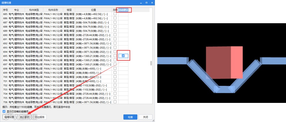 ①可按照设定的检查构件范围检查构件图元的碰撞,提前暴露工程项目中单个专业、各专业间的图元在空间上的碰撞冲突,提前予以预警;