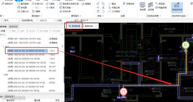 ②弹出“自动布线|智能绘制”功能页签,自动查找起终点,并根据起终点生成线缆.