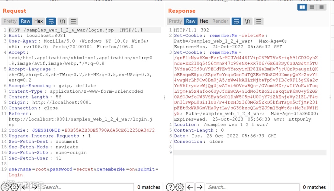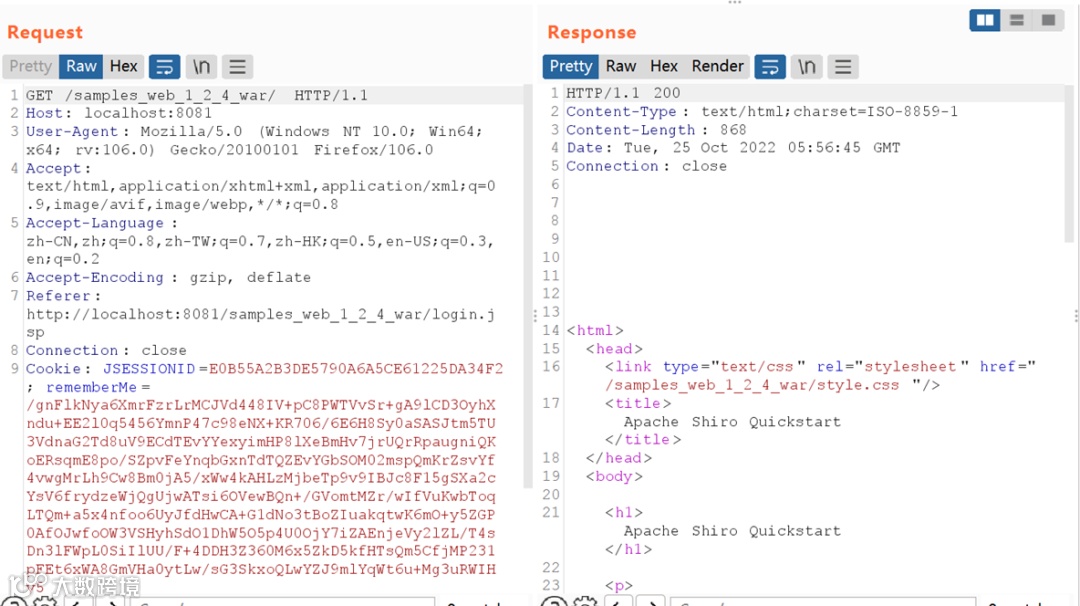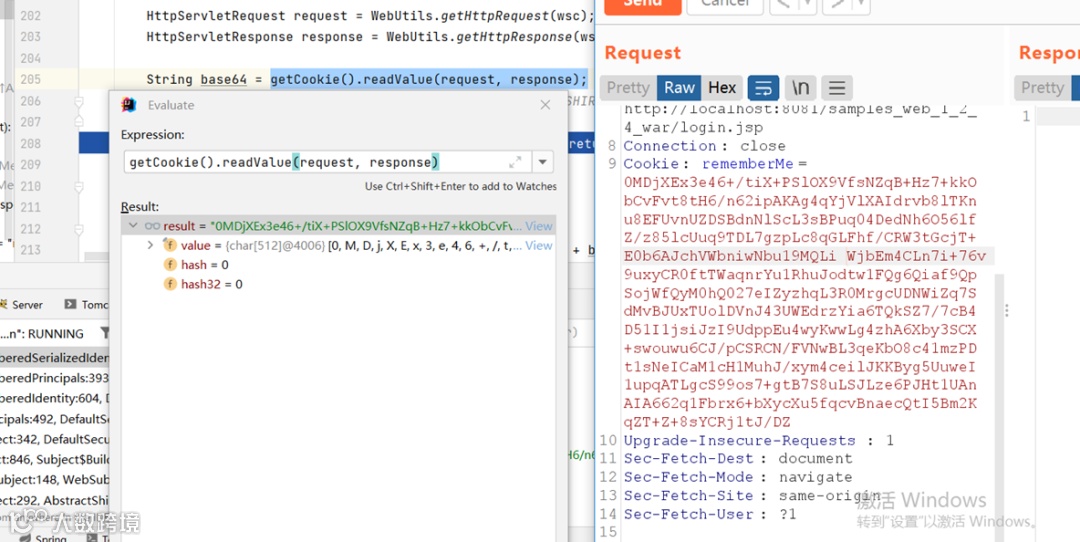 刷新页面,拦截请求数据包,删除cookie中的sessionID即可触发解密rememberMe的片段。
