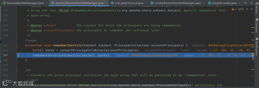 在rememberSerializedIdentity方法中,152行对参数serialized进行base64编码,serialized参数是在执行convertPrincipalsToBytes方法后得到的结果。然后将base64编码后的字符串放入cookie中。