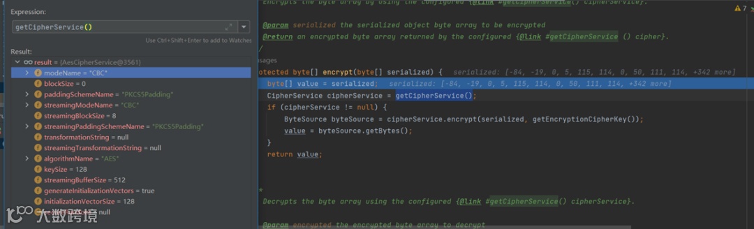 在cipherService.encrypt()方法中,传递了两个参数,getEncryptionCipherKey()是获取秘钥的方法。跟进getEncryptionCipherKey()