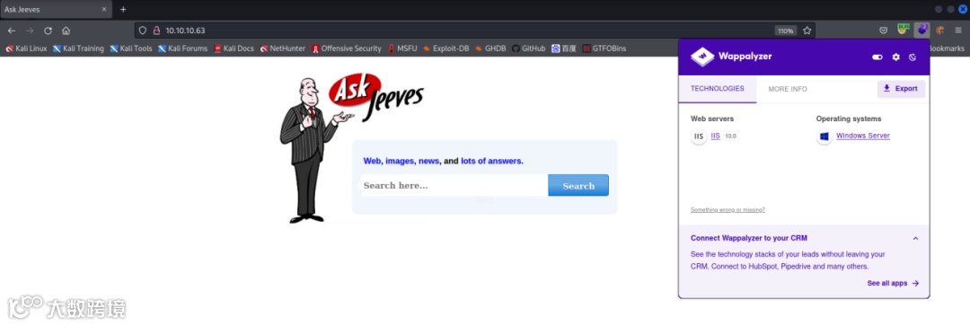 80/tcp open http Microsoft IIS httpd 10.0|_http-title: Ask Jeeves| http-methods: | Supported Methods: OPTIONS TRACE GET HEAD POST|_ Potentially risky methods: TRACE|_http-server-header: Microsoft-IIS/10.0135/tcp open msrpc Microsoft Windows RPC445/tcp open microsoft-ds Microsoft Windows 7 - 10 microsoft-ds (workgroup: WORKGROUP)50000/tcp open http Jetty 9.4.z-SNAPSHOT|_http-title: Error 404 Not Found|_http-server-header: Jetty(9.4.z-SNAPSHOT) Warning: OSScan results may be unreliable because we could not find at least 1 open and 1 closed portAggressive OS guesses: Microsoft Windows Server 2008 R2 (91%), Microsoft Windows 10 1511 - 1607 (87%), Microsoft Windows 8.1 Update 1 (86%), Microsoft Windows Phone 7.5 or 8.0 (86%), FreeBSD 6.2-RELEASE (86%), Microsoft Windows 10 1607 (85%), Microsoft Windows 7 or Windows Server 2008 R2 (85%), Microsoft Windows Server 2008 R2 or Windows 8.1 (85%), Microsoft Windows Server 2008 R2 SP1 or Windows 8 (85%), Microsoft Windows Server 2008 SP1 or Windows Server 2008 R2 (85%)No exact OS matches for host (test conditions non-ideal).Uptime guess: 0.009 days (since Tue Jul 12 16:17:49 2022)Network Distance: 2 hopsTCP Sequence Prediction: Difficulty=264 (Good luck!)IP ID Sequence Generation: IncrementalService Info: Host: JEEVES; OS: Windows; CPE: cpe:/o:microsoft:windowsHost script results:| smb2-security-mode: | 3.1.1: |_ Message signing enabled but not required| smb-security-mode: | account_used: guest| authentication_level: user| challenge_response: supported|_ message_signing: disabled (dangerous, but default)| smb2-time: | date: 2022-07-12T13:29:59|_ start_date: 2022-07-12T13:18:01|_clock-skew: mean: 4h59m59s, deviation: 0s, median: 4h59m58sTRACEROUTE (using port 135/tcp)HOP RTT ADDRESS1 136.17 ms bogon (10.10.14.1)2 136.31 ms localhost (10.10.10.63)
