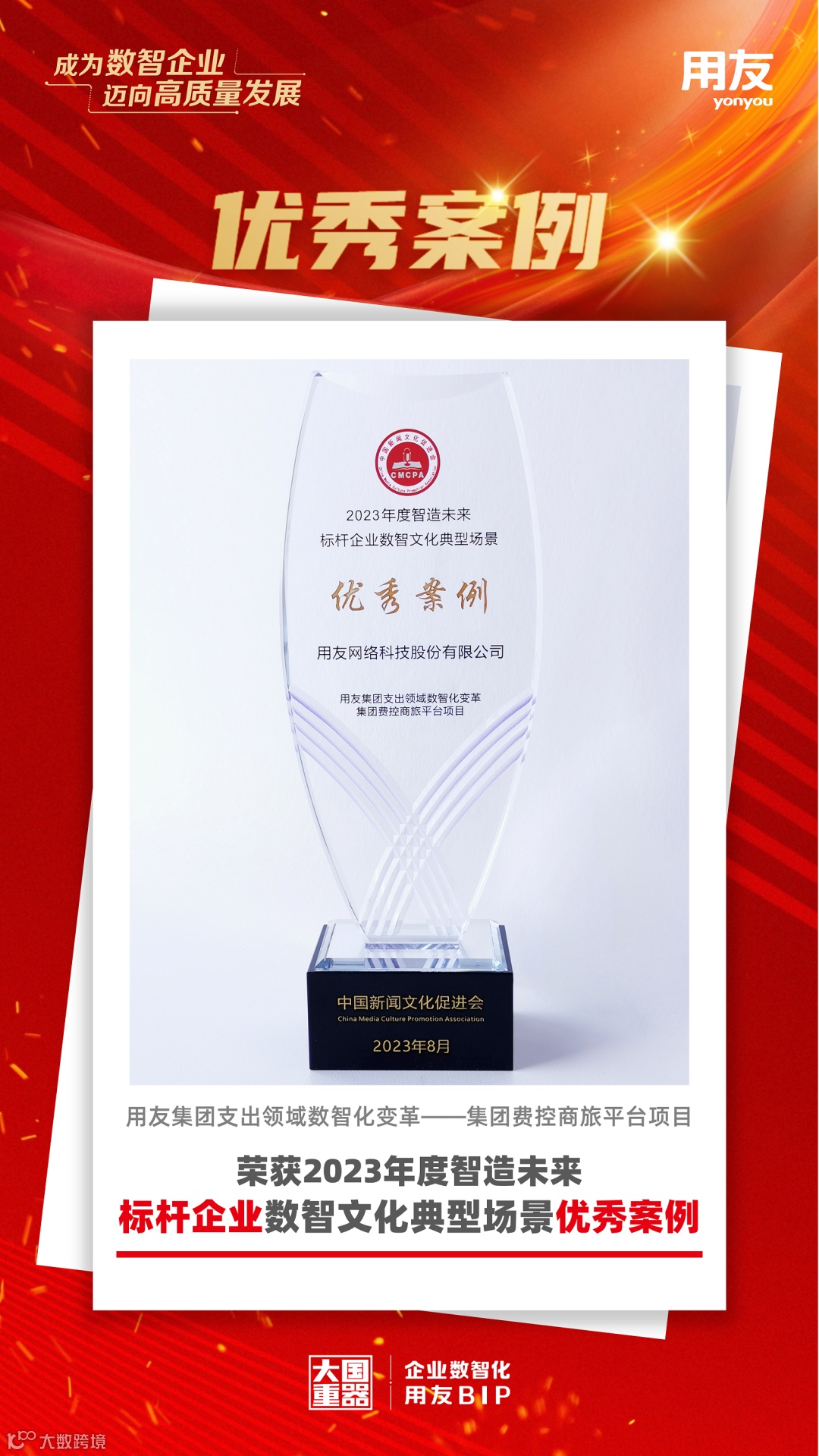 近日,中国新闻文化促进会发布《2023年度“智造未来—标杆企业数智文化案例征集推广活动”入选案例》榜单。用友集团支出领域数智化变革一集团费控商旅平台项目获评“2023年度智造未来标杆企业数智文化典型场景优秀案例”。