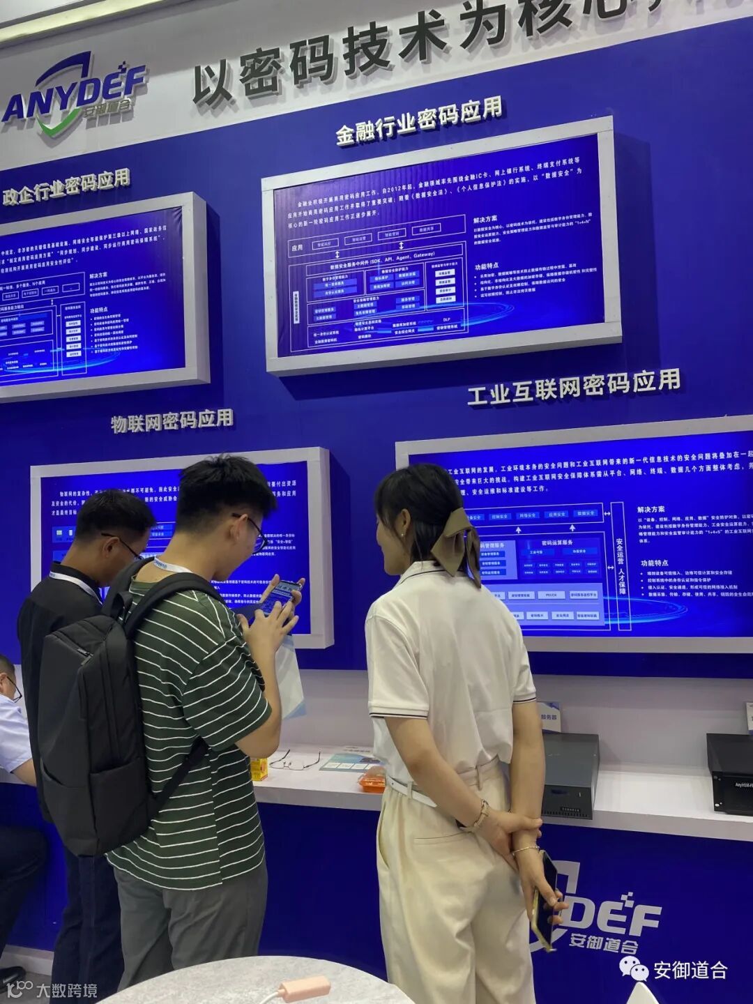 安御道合凭借多年在商用密码领域的技术沉淀结合客户实际业务,以密码应用场景为切入点,为展会现场客户展示了金融行业密码应用场景、政企密码应用场景、物联网安全密码应用场景和工业互联网密码应用场景。