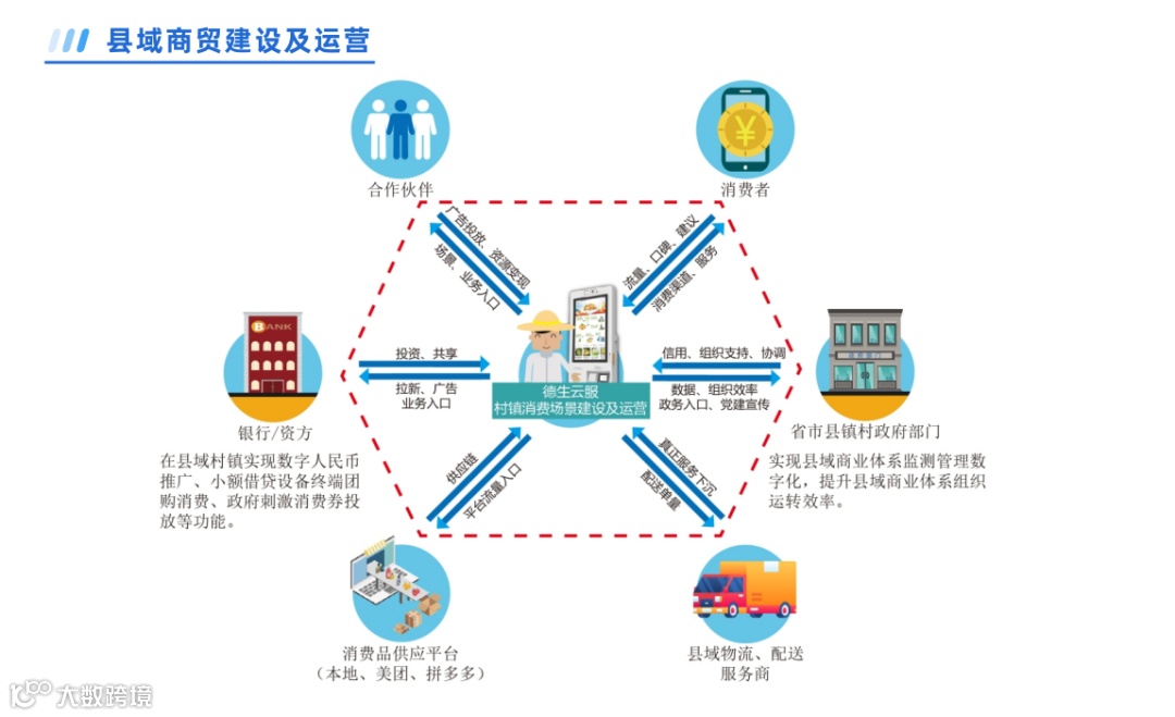 未来,德生科技将通过联动多方资源参与。一方面,通过服务提高县域商业体系建设成效及政府运营效率。另一方面,借力银行对数字人民币推广、小额借贷、消费券投放等需求,整合银行为镇村级商业网点引入设备,推动资源要素向农村市场倾斜。为消费品供应平台提供流量转接入口,真正做到服务下沉,广告投放与资源变现。达到刺激和升级农村消费的最终目标,实现多方共赢的目的。