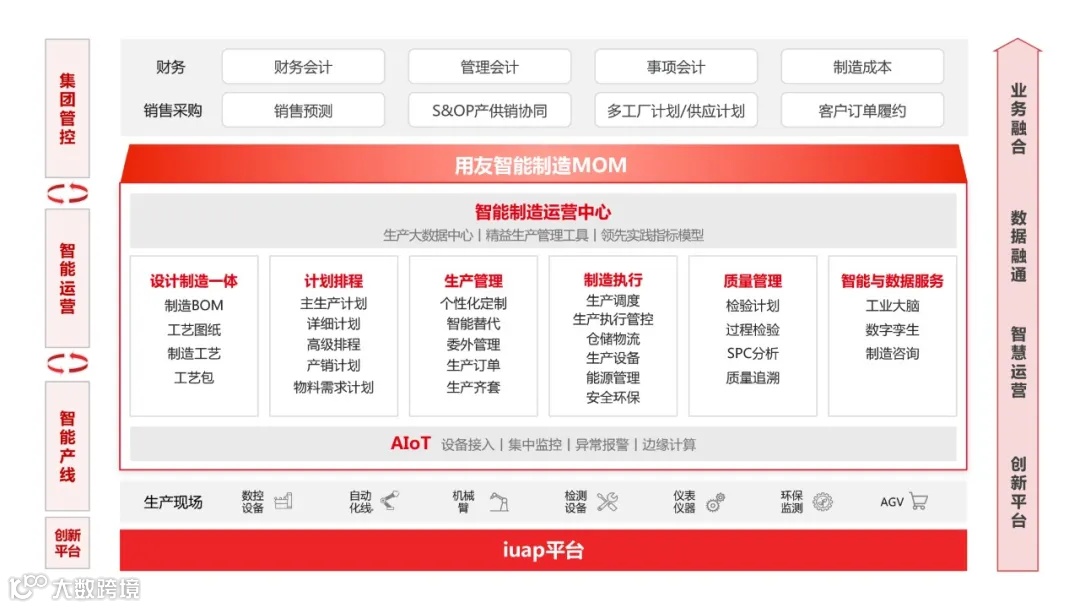 用友智能制造MOM2.0集成了生产运营指挥中心、设计制造一体化、智能工厂构建、智能优化排程、数字孪生、工业大脑及AIOT物联网应用,形成了一站式、全方位的解决方案。我们实现了生产现场的全景可视化与精准控制,促进了IT与OT技术的深度融合,为生产制造的优化升级提供了强大支撑。此外,通过无缝对接ERP与MES系统,不仅覆盖了生产企业的采购、销售、财务等各个环节,更聚焦于制造运营的深度优化,为企业创造核心价值,引领其迈向智能制造的新高度。