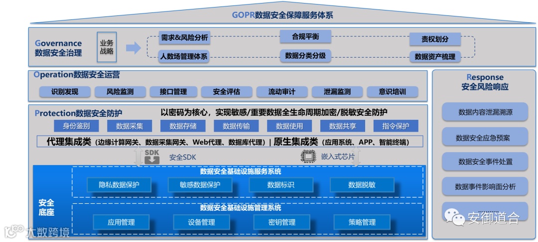 数据安全风险不仅存在于传统的信息系统,同时在物联网环境中采集、传输、存储、使用、分享等节点凸显,实践证明仅采用传统的边界防护手段难以覆盖所有环节。面对这些问题,安御道合结合多年的安全实践,以数据动态安全治理理念为指导,梳理一套以密码技术为支撑的GOPR数据安全保障服务体系,聚焦数据安全防护,从数据全生命周期角度防护出发,提供“数据全生命周期加密/脱敏”的安全防护能力,打造合规密码应用的安全底座。