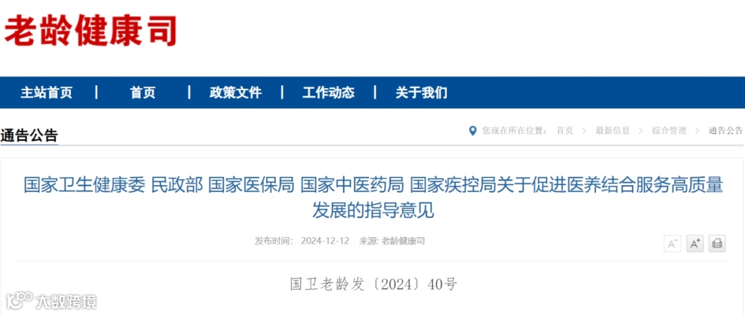 12月12日,国家卫健委等五部门联合发布《关于促进医养结合